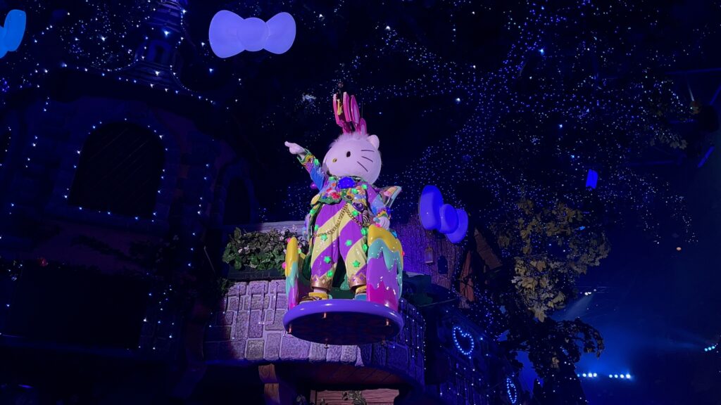 パレードが公演されるパーク内の中心部に位置する「知恵の樹」の周辺エリアはパレード中シーンごとにライティングが頻繁に変わり、レーザーが飛び交います。ファンタジーの世界全開の世界観であるにもかかわらずサイバーっぽい演出を使っていても、しっかりファンタジー感あふれるようになっているのはスゴい。「上から降りてくる」キティとダニエルもかなり衝撃的な演出。