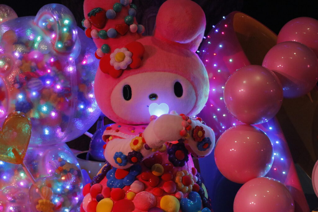 そして、そんな知恵の樹が見守るピューロランドのアニバーサリーをお祝いするフェスティバルが始まります。サンリオの仲間たちが「思いやり」「なかよく」「KAWAII」のハートを持って集まってきます。この3つのハートはゲストを含め誰もが持っているもので、パーク内で販売されている参加アイテム「ミラクル♡ライト」を持っているとパレード中演出に合わせて光ります。