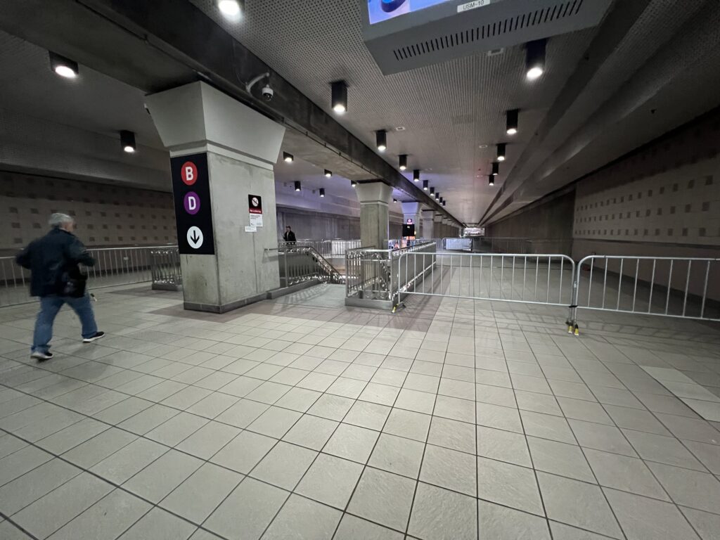 ユニオンステーションのメトロリンクホームから二階層降りたところに地下鉄の改札があります。案内板を見ながら進めば迷うことなく改札までたどり着くことができるはず。ユニオンステーションはハブ駅のようになっていて、いくつかの地下鉄路線が通っています。イメージとしては東京メトロの改札内的な感じ。ユニバーサルシティまで行く路線はBラインです。